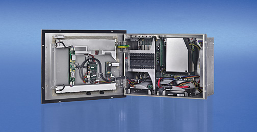机箱可从前面打开。通过前盖后面的挂锁可打开前门。用户和维护人员有不同的权限操控不同的按键。打开前门,无需任何工具即可更换组件:在现场,在几秒种内就可更换 PC 硬盘,以便升级软件。
